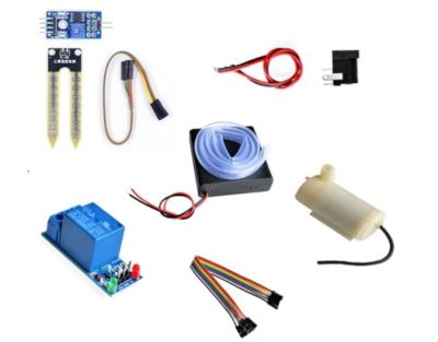 kosteusanturi+lukija, relemoduuli, paristokotelo, DC-liitin (2,1/5,5mm), vesipumppu, Dupont-liitäntäjohdot, 50 cm kasteluletku